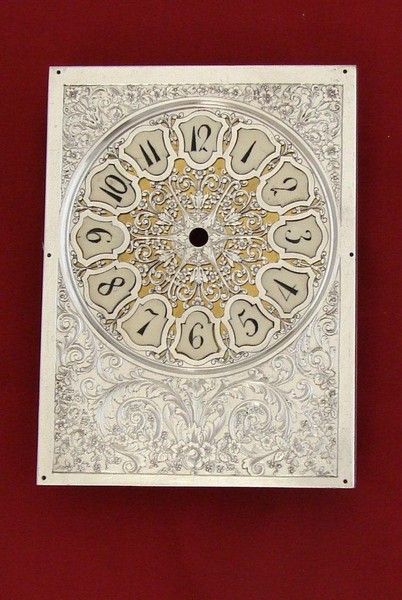 The dial is one of the finest we have seen on a French carriage clock and we have never encountered a similar one. Its arabic ivory? numerals are roughly in the form of a shield, each of which is surrounded by a silvered band 0.1" wide. There is silver engraving immediately outside and between each of the numerals and extending down from these is a delicate silver flower. The dial-plate is gilded and overlying this inside the numerals is an exquisitely executed raised silvered mask with delicate floral decoration to apparently support each of the numerals.
