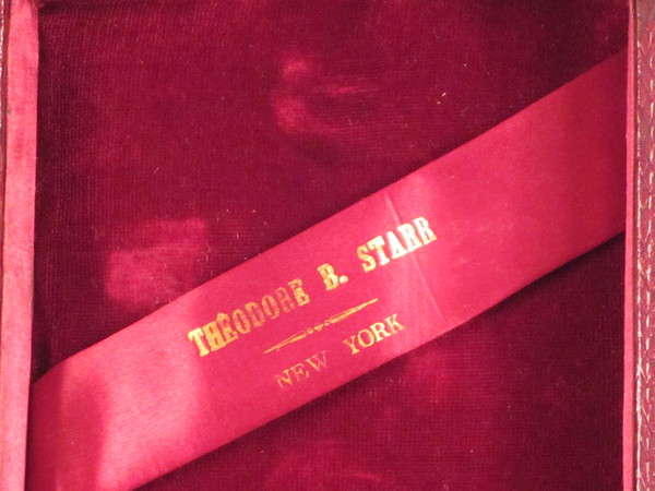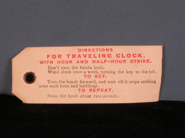 D346. This clock, of particularly fine quality, is the most totally original one we can recall having encountered and even comes with the retailers instructions for taking care of it, such as regulating and starting it and setting the alarm. It also has the red silk label in the lid of the travelling box of Theodore B Starr of New York who would have retailed it. He is recorded as having an outlet as a jeweller at 206 Fifth Avenue from 1877 to 1900.