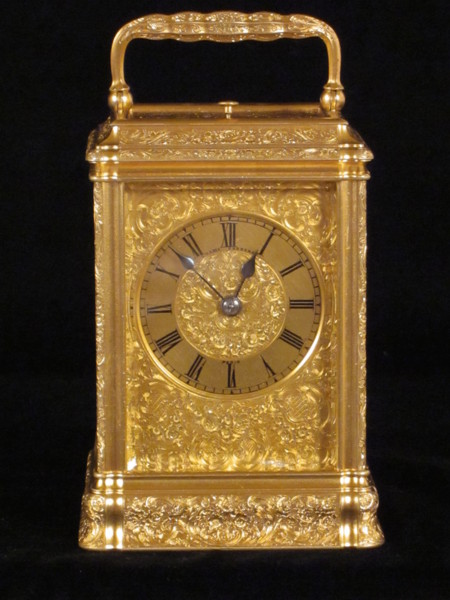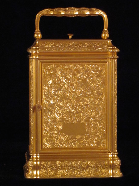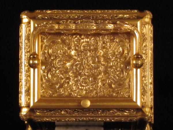 We cannot recall having seen a better quality gorge cased clock. It is smothered in fine and very detailed engraving of particularly good quality. Instead of the usual glazing to the sides, back and top superbly engraved panels are employed.
