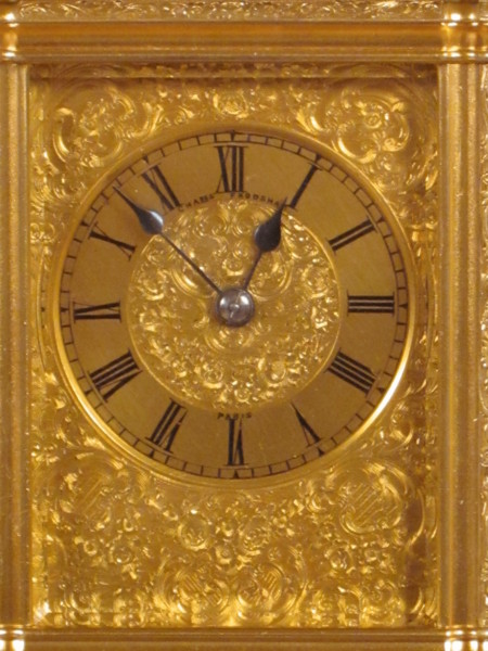 D254. An exceptionally fine gorge cased carriage clock, probably specially commissioned by Charles Frodsham, whose name is engraved in flowing script across the bottom of the backplate, for an important customer; the most likely supplier being Drocourt. It has petite sonnerie striking on two bells, ie the clock strikes the hour on one bell at a relatively low note. At a quarter past a double note or ting-tang is struck; at half past two ting tangs and at a quarter to the hour three. When the clock is repeated it will sound the last hour followed by the last quarter, as with a grande sonnerie clock. There is also a strike/silent lever in the base.