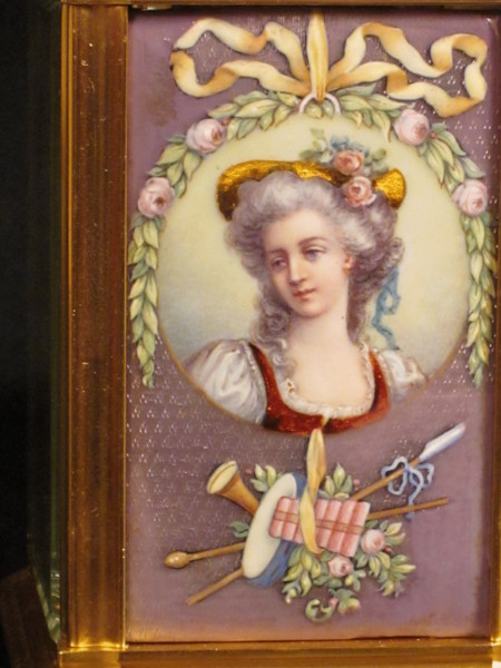 The dial has an enamelled chapter ring with roman numerals surrounded by a gilt ring and having a matching centre. Above the dial is a ribbon tied bow with a smaller swag of flowers below draped down either side of the chapter ring and arched over the top of the picture of a young lady below.