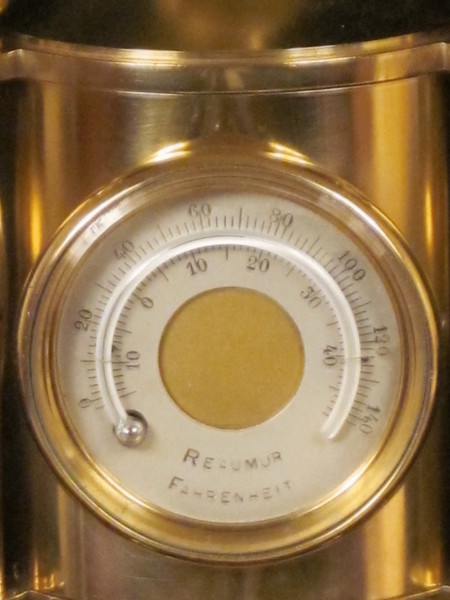 It has a ring carrying handle on top beneath which is a ‘ lamp’ and a compass. There are three brass columns surrounding and supporting the body of the clock between which are three silvered dials, one for time, a second for Reamur / Fahrenheit and the third is a barometer. Below is the ‘ lamp’.