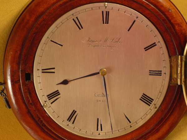 A small and rare 8 day wall clock, one of a small series made by this eminent maker, contained in a turned solid mahogany case. It has a 6" circular engraved and silvered dial which is signed and numbered by the maker, as is the backplate of the movement. It employs a chain fusee and plain balance wheel, as was often favoured by this maker.