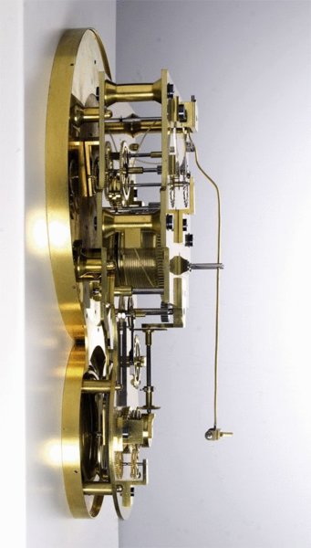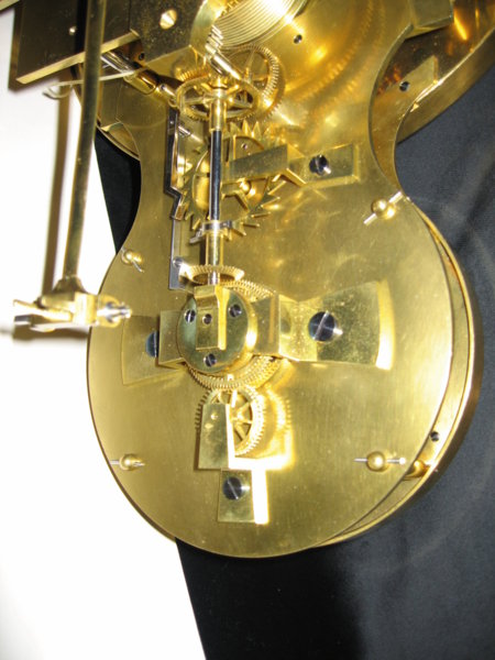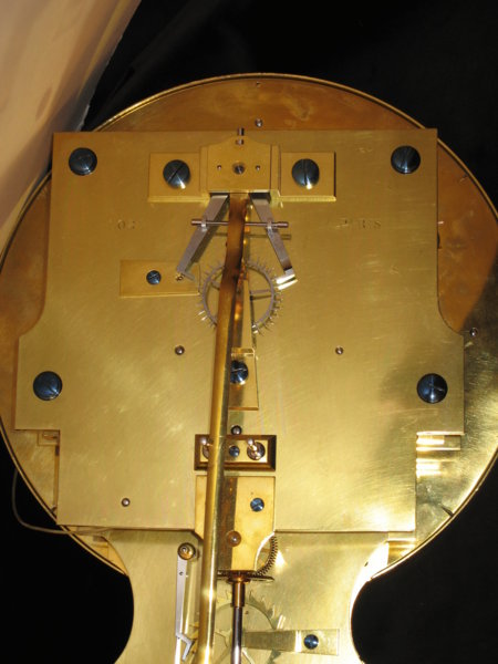 The massive gilt rectangular brass movement with shaped pillars, blued screws, a five-wheel train with an adjustable precision dead-beat escapement with jeweled pallets and a steel escape wheel. There is a steel shaft descending to the lower dial which has a five-wheel train and a large kidney-shaped equation cam.