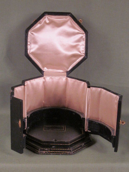The clock rests on and is protected by an octagonal leather covered travelling box lined with padded off white silk. Let into the bottom of this is a lidded recess for the winding key.