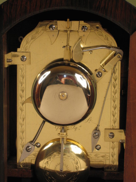 The substantial movement, virtually filling the case, has shaped plates with floral engraving to the border and on the pendulum bob. A pendulum clamp is provided which is partially concealed by the bell as is Purvis’s signature.