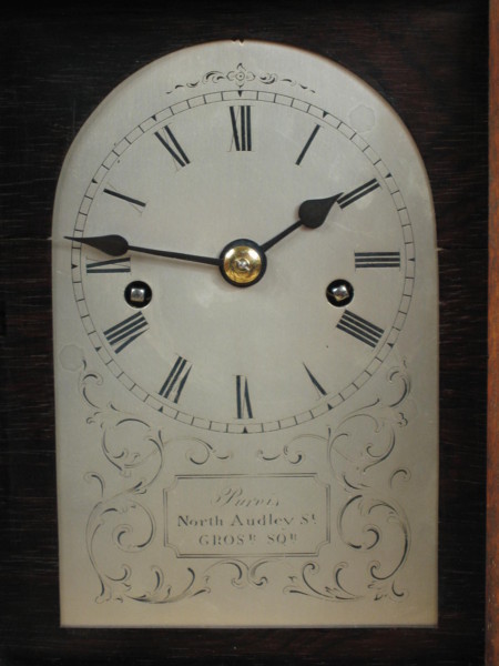 This most attractive clock, standing just over 10" high, has a shallow arched top, glazed sides surrounded by a brass bezel and rests on rosewood bun feet. The front of the case is brass inlaid and a substantial brass bezel surrounds the arched silvered dial which employs roman numerals. Below the chapter ring is a plaque signed Purvis, North Audley Street, Gros’r Sqr.