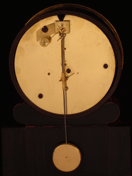 A single train French movement is employed with silk suspension which is unusual in having a third larger plate to the rear, which has probably been fitted to exclude dust from the movement.