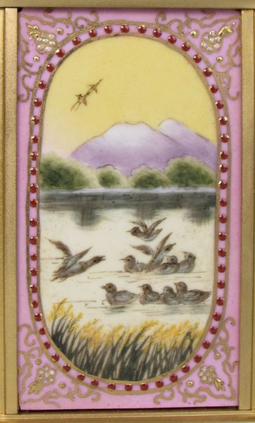 A porcelain panelled carriage clock; the eight-day duration movement has a platform lever escapement and strikes the hours and half-hours on a gong with push button repeat of the last hour at will. The backplate is stamped with the serial number 2183 and has certain attributes similar to clocks made in Saint-Nicolas-d’Aliermont by Holingue frères, blanc roulant maker to Drocourt. The pink porcelain dial has raised gilt decoration, depicting red and white flowers, with the centre decorated with ducks in flight, whilst the chapter ring has black Roman numerals and blued steel spade hands. The matching pink porcelain side panels are decorated with ducks taking flight from reeds to one side and ducks on the water with mountains behind on the other, both within oval framing.