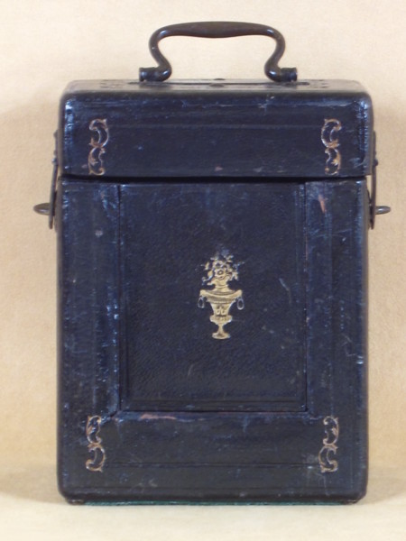 The leather travelling case, which has been relined, is still in good order. It has a carrying handle on top which has an embossed design around it and side clips. The sides and back are also embossed. There is further gilt decoration to the front, including a gilt urn with flowers to the slide-up front door.