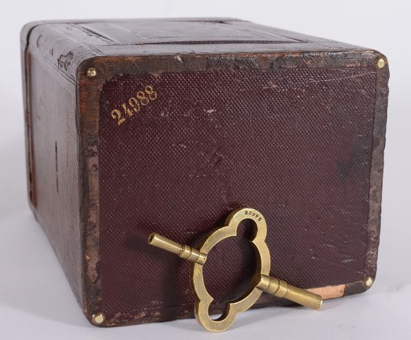 The eight-day duration movement strikes the hours and half-hours on a gong, with a push button repeat of the last hour at will. The backplate is stamped with the Drocourt trademark along with the serial number 24988, which is repeated to the original large winding key as well as to the base of the travelling box.