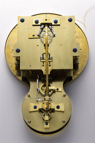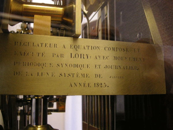 It is also inscribed on the movement: Régulateur Astronomique Command par le Gé al Baron d’Arlincourt and bearing the coat of arms of Victor Prévost, Vicomte d’Arlincourt and further inscribed ‘Régulateur à equation, compose et execute par Lory: avec movement périodique synodique et journalier de la lune systême de Janvier année 1823. On the temperature scale on the pendulum is engraved: Elementa Suis Proprius Armis Victa and further inscribed on a silvered plaque attached to the pendulum: Pendulum de Compensation execute par Lory 1823.