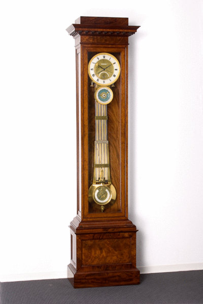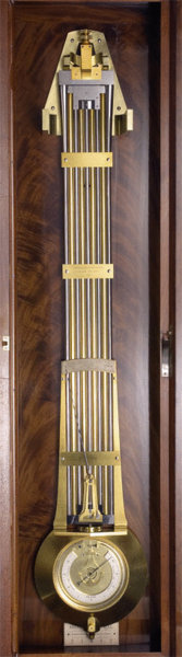 There is an adjustable knife edge suspension for the nine rod gridiron pendulum to ensure that it can be put into place and then lowered onto the knife edge without this being damaged. The pendulum has temperature indications 5-25 degrees centigrade and a finely executed thermometer with silvered scale applied to the bob, having the rare feature of a superbly executed bimetallic strip running around the inside of the bob. The scale indicates the actual temperature while an elongated pointer going up to the pendulum shows the amount of temperature compensation being made.