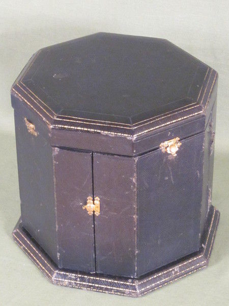 The clock rests on and is protected by an octagonal leather covered travelling box lined with padded off white silk. Let into the bottom of this is a lidded recess for the winding key.