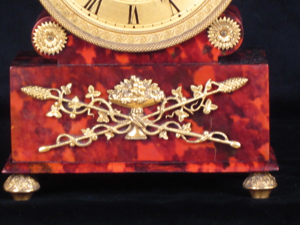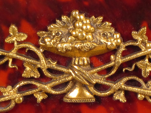 The case, veneered in well figured tortoiseshell, has a drum shaped top which rests on a rectangular base supported by four small gilded feet with floral decoration. Applied to the front is a particularly fine gilded mount consisting of crossed staves terminating in cones with vine leaves entwined around them. To the bottom corners of the dial are delicate floral paterae.
