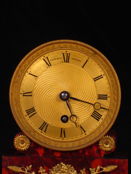 D304. A most attractive little clock signed to either side of 12 0'clock Viner & Co, London. The dial, a little over 4.5" in diameter, including the finely executed gilded bezel, has a matt gilt chapter ring with roman numerals and a particularly well executed scrolled and engine turned centre.
